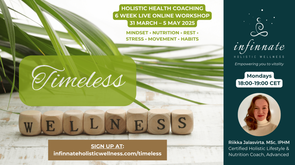Reclaim your vitality with Timeless Wellness: a 6-week, interactive, online holistic health coaching workshop covering the foundations of wellbeing: mindset, nutrition, rest, stress, movement, and habits.